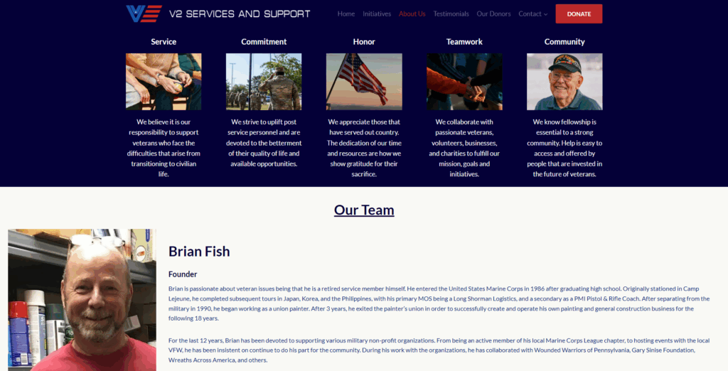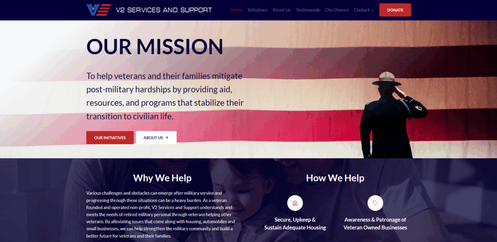This initiative called for a complete Branding experience starting with a simple but powerful name that captures Brian’s vision. Brand Image from the ground up was needed to form an unforgettable impression. Brand Identity was also needed to develop important pillars such as a clear mission statement, solid core values, along with messaging that provides a complete understand about what V² works to accomplish. To communicate this to the public, an informative, but clear and concise website was needed to attract volunteers, donors, and more importantly veterans.